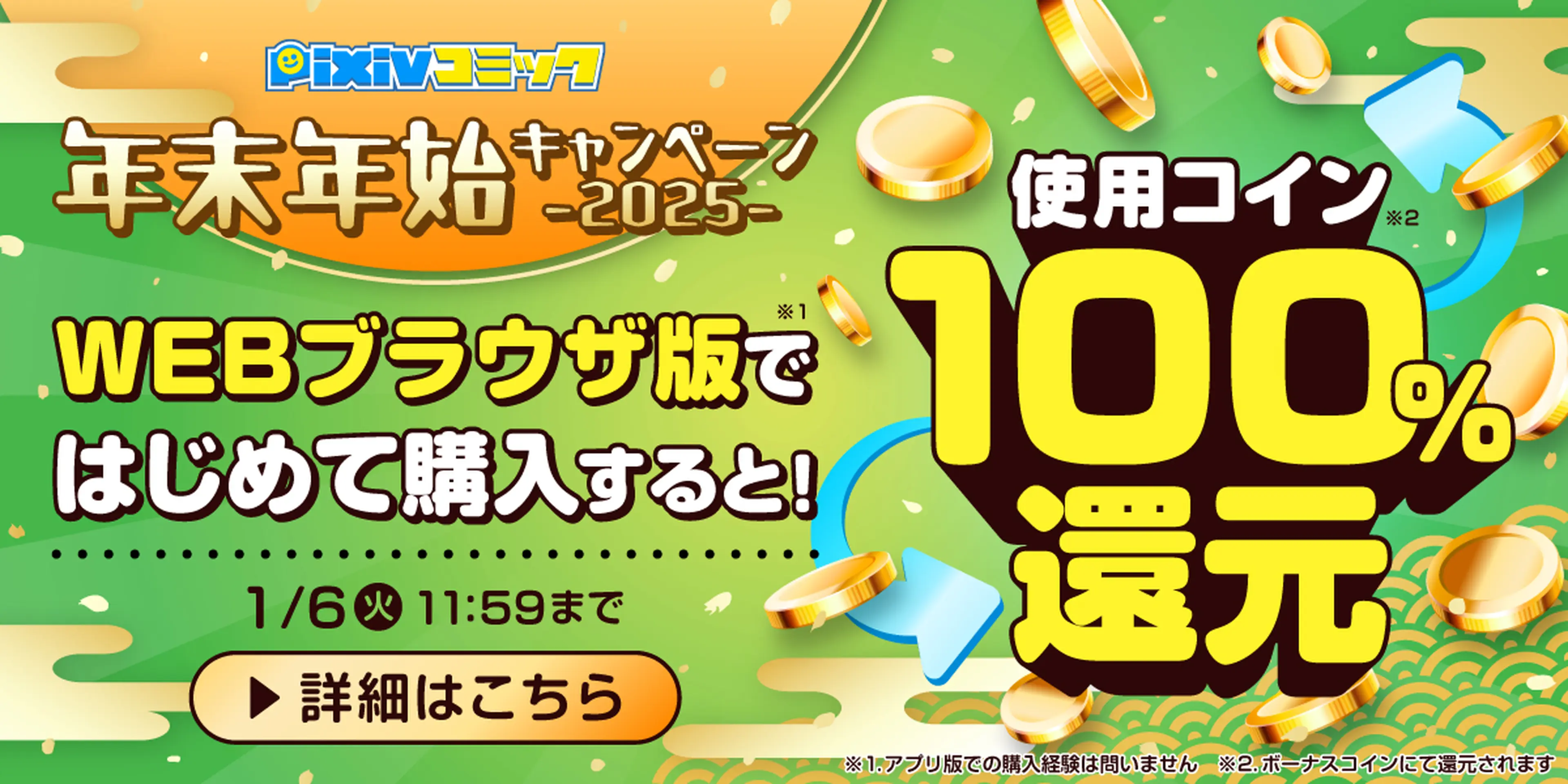 期間中、【WEBブラウザ版pixivコミック】にてはじめて単行本をご購入された方全員に、ご購入金額と同額のボーナスコインを後日還元いたします。