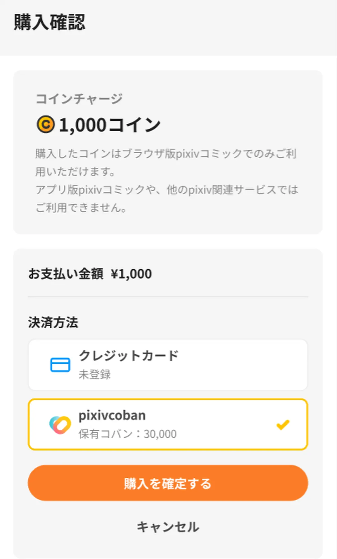 ※ 不足分のコインに対して、保有しているpixivcobanが満たない場合は、「購入を確定する」ボタンからpixivcobanを追加チャージすることで、購入を完了できます。