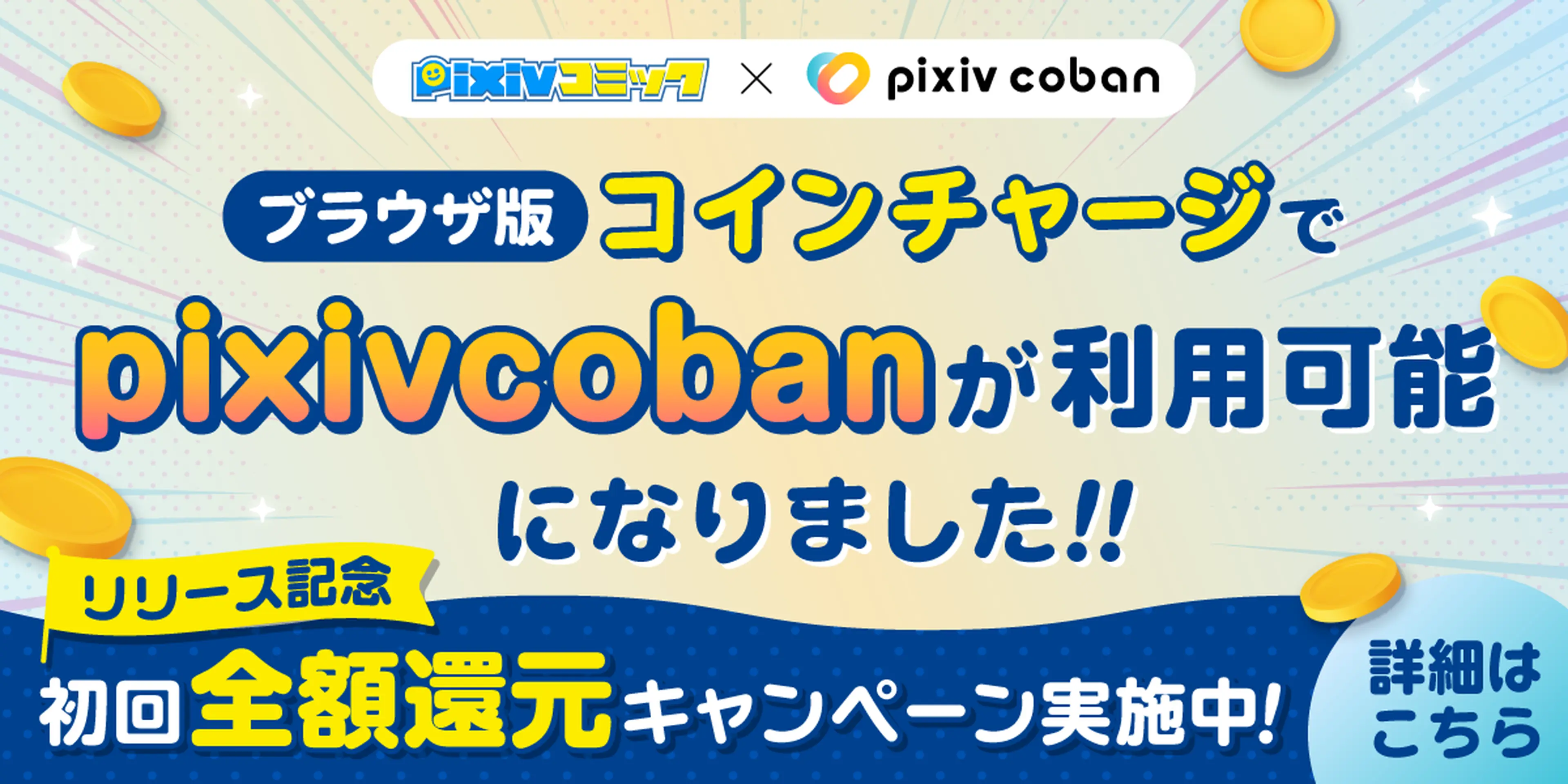 期間中にpixivcobanを利用してはじめてブラウザ版コインチャージをすると、なんとチャージしたコイン全額分を還元!
